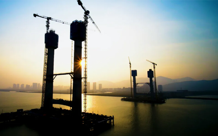 六台徐工塔机助建六横公路大桥,六六大顺,一顺百顺,施工现场,徐工群塔高效运转 星辰影视,相互配合,完成结构件吊装,为海上“巨龙”插上腾飞的“翅膀”。
