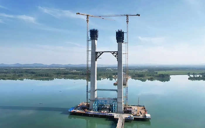 大桥主塔采用“H”型造型结构,总高度201米,XGT360-20S1 星辰影视在线,XGT7528A-18S1屹立在大桥两侧肩负主要吊装工作,满勤作业,高效运转,保障高空对接安全,双塔协力频频突破重要建设节点。