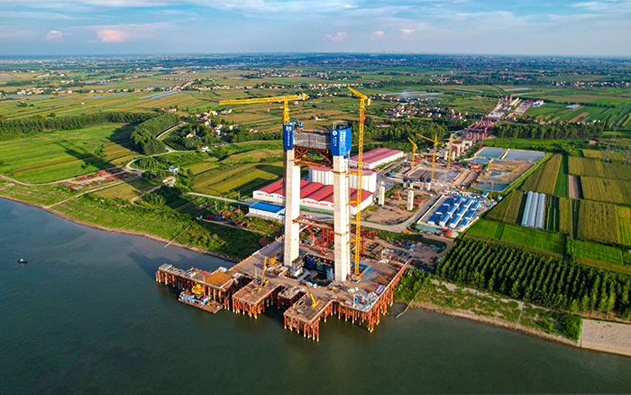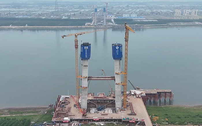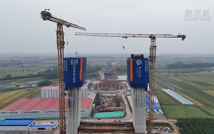 初秋时节,长江之畔,两台徐工XGT600A-25S塔机铁臂挥舞,助力荆州李埠长江公铁大桥南岸主塔下游侧第18节塔柱顺利完成浇筑 星辰影视。