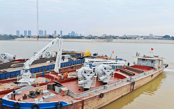 近日 星辰影视,专为水上施工定制的两台徐工船载式布料机与八台船载式搅拌罐装车顺利集结,正式发往越南,将投入到当地重点跨河大桥项目建设中。