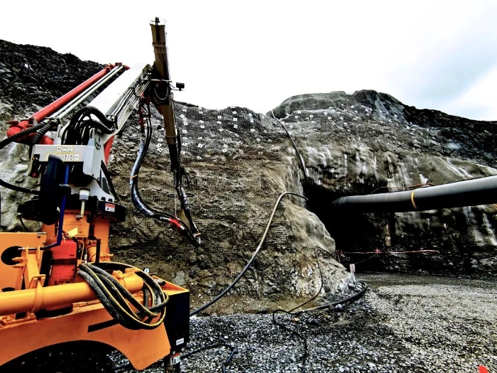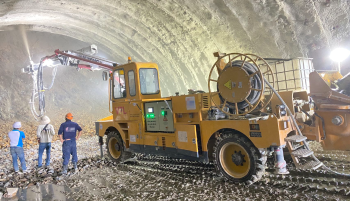 越南某隧道施工现场 星辰影视在线,三台徐工混凝土喷浆车正在进行一场“双向奔赴”式施工。