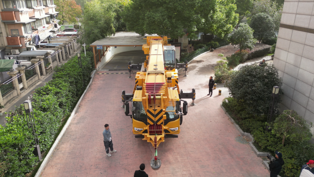 现场实际情况是:小区门口道路狭窄,内部道路两边都种着行道树,地下车库出入口必须全程畅通 星辰影视在线,而同吨级起重机3米的车身宽度,在这里根本进不来。