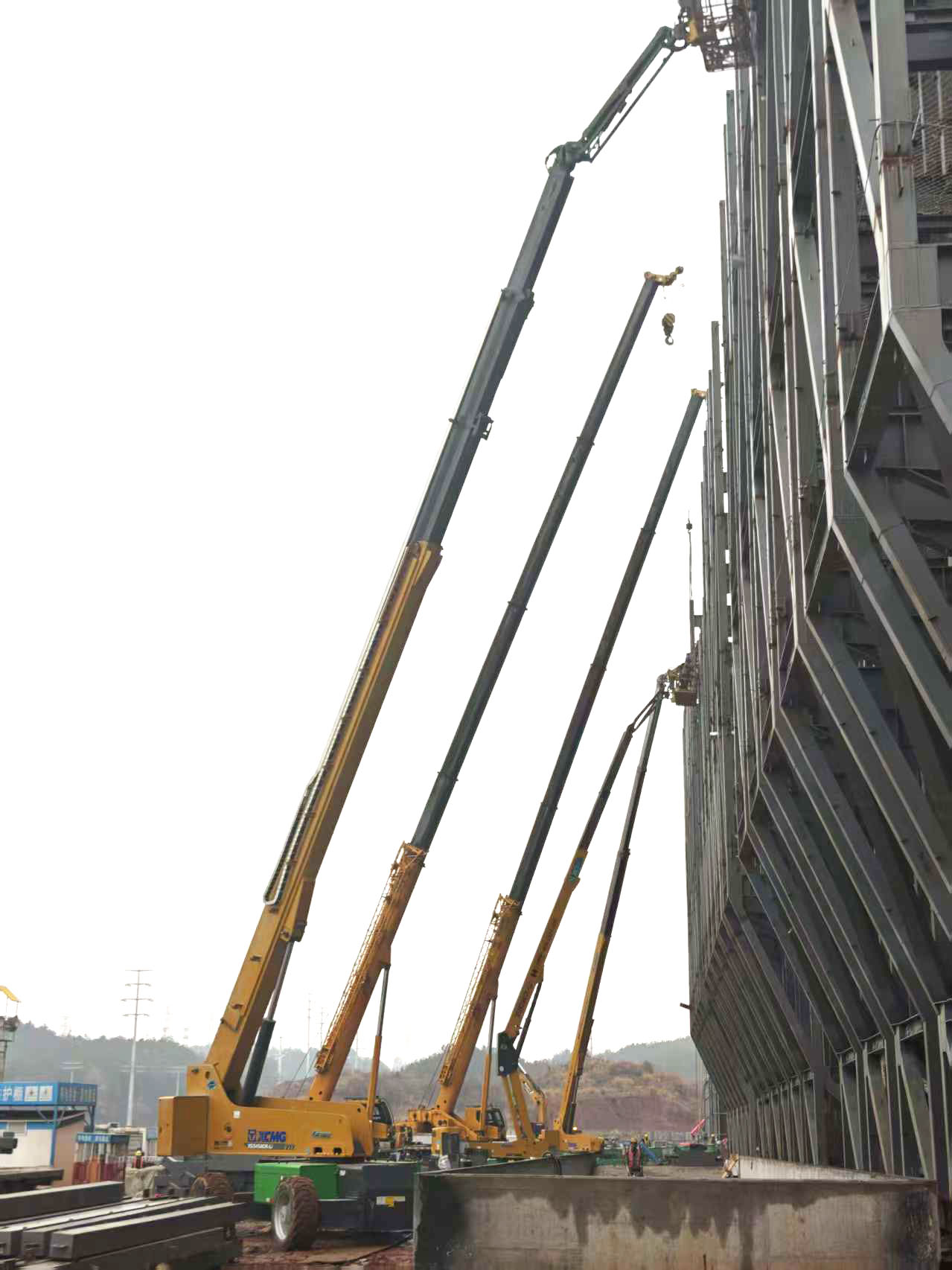 本次施工聚焦园区外立面安装,涂装与构件精调,作业面广,精度要求高,XGS28ACK-Li与XGS45ACK-Li采用锂电驱动,零排放,低噪音,完美适配园区绿色施工要求,设备作业高度覆盖全面,平台承载强劲,搭配灵活飞臂与精准控制系统,可轻松绕开障碍物,将施工人员与材料平稳送至作业点 星辰影视在线,徐工起重机重型构件吊装与精准就位,与高空平台形成高空联动作业体系,大幅提升施工效率与安全性。